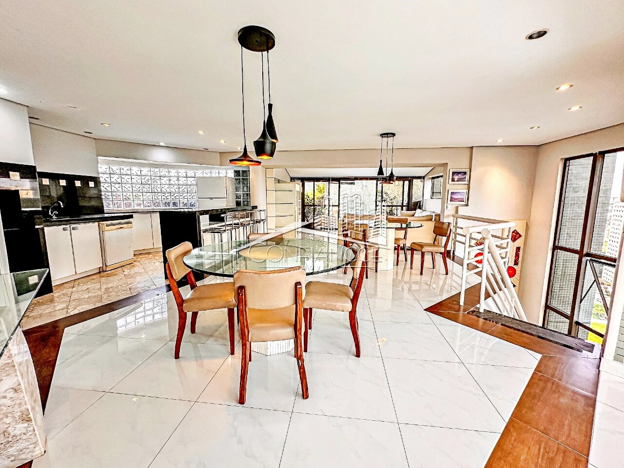 Sala espaçosa para três ambientes, com lareira e sacada panorâmica