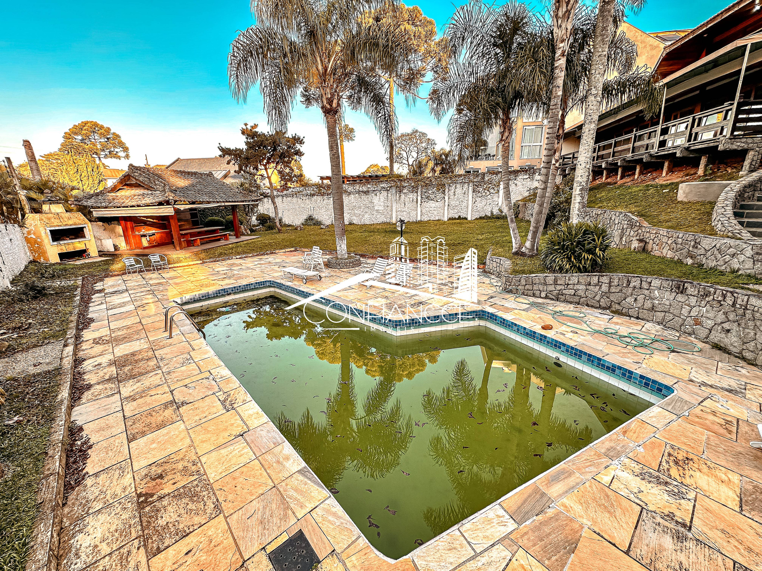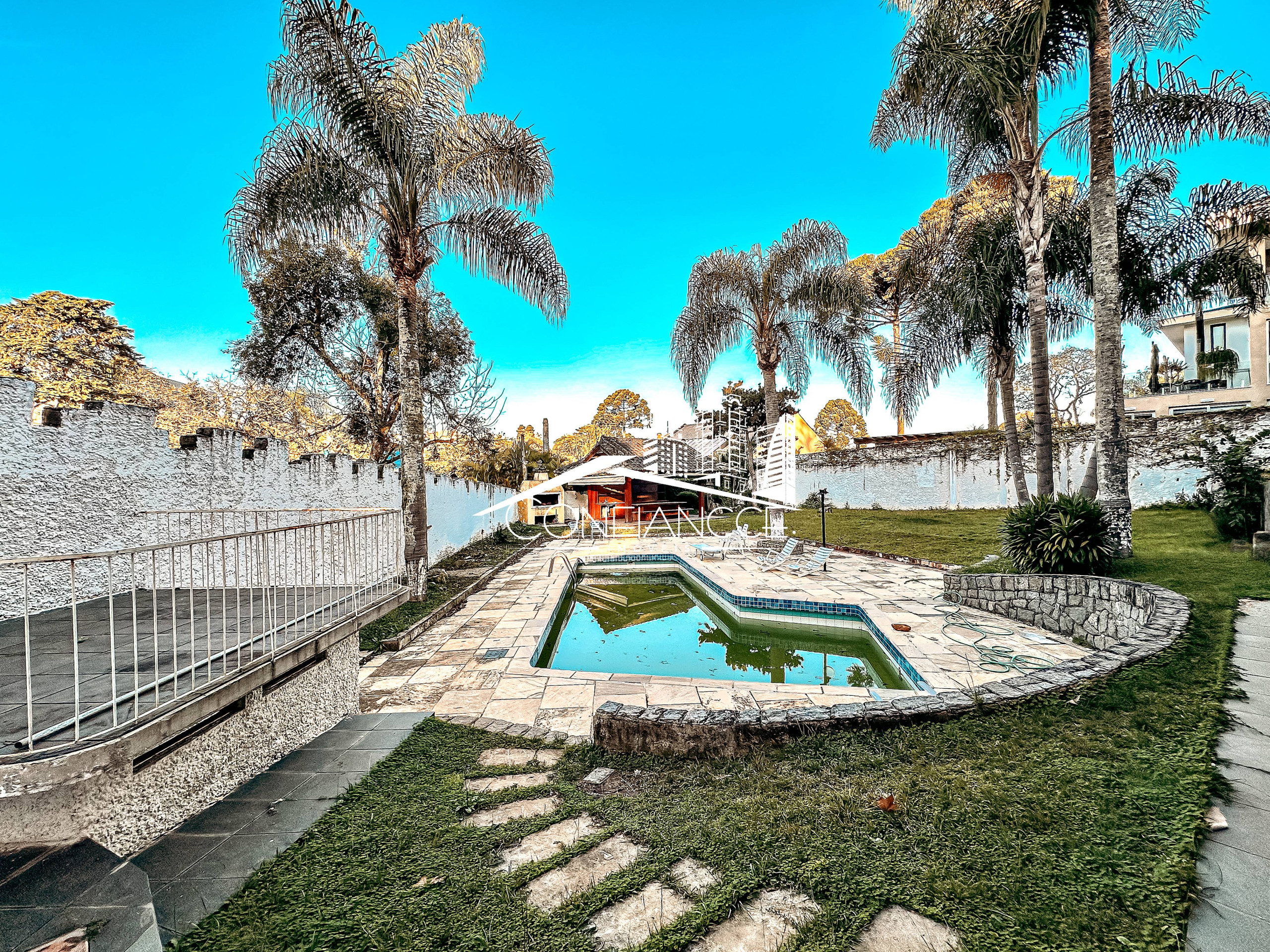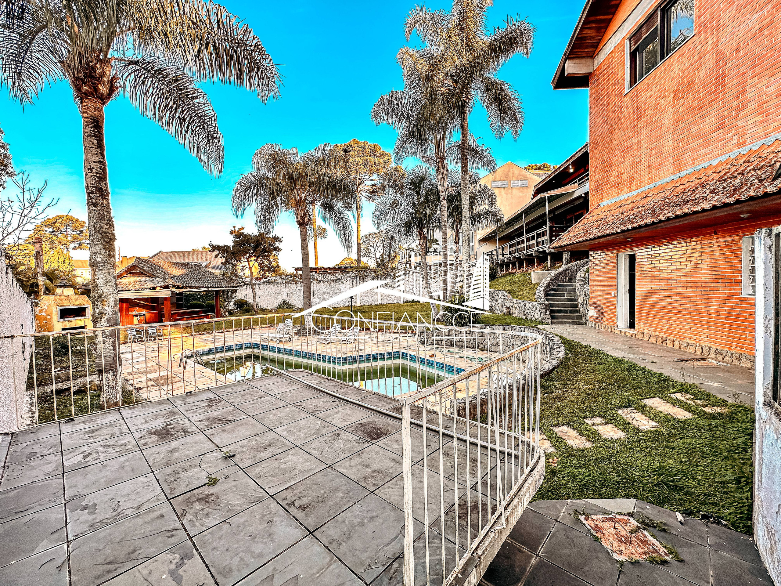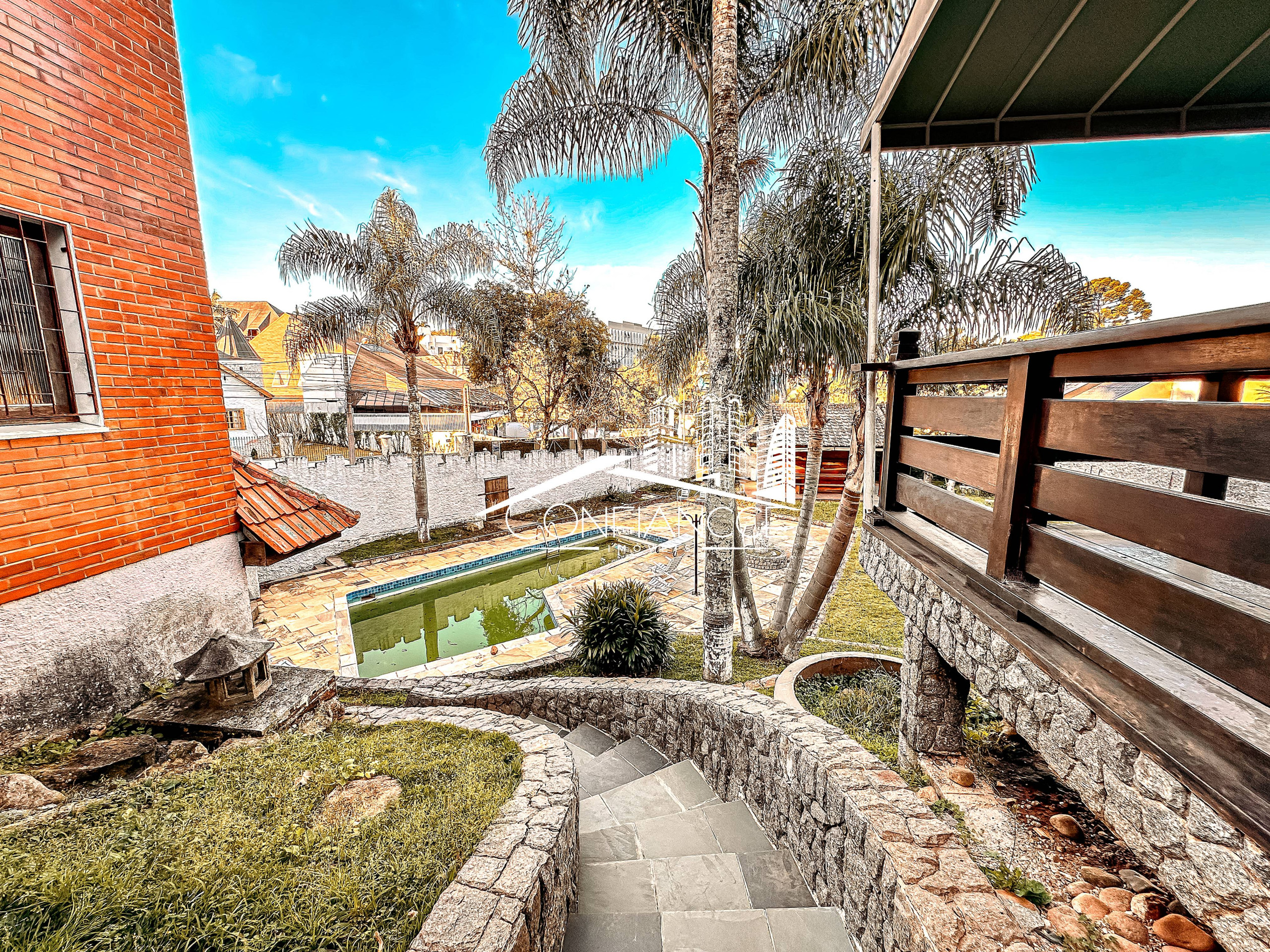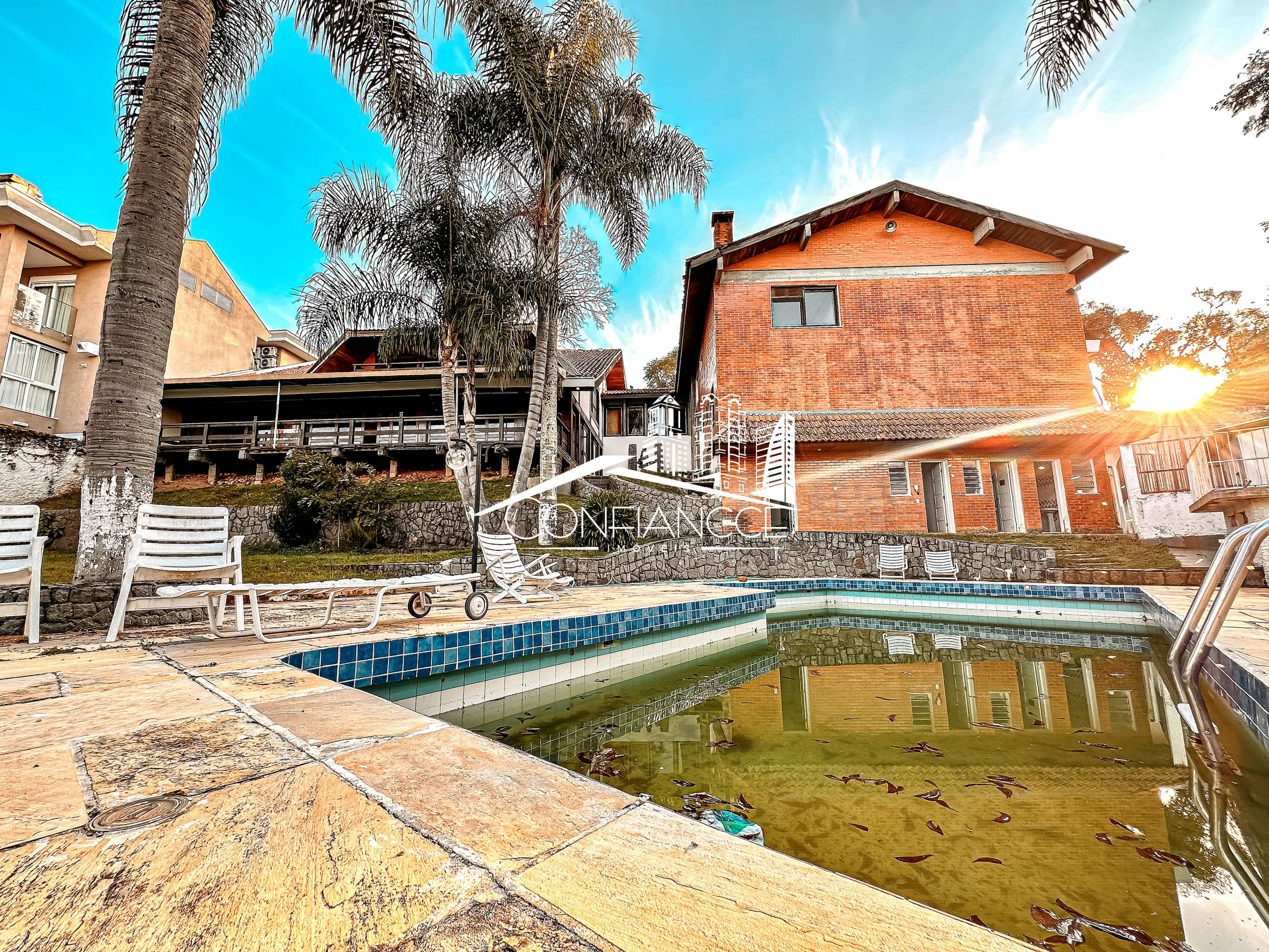 - Possui sala de estar, sala de jantar, cozinha com armários, 7 dormitórios (sendo 1 suíte), varanda, jardim, piscina, área de festas com churrasqueira, e vaga de garagem coberta e descoberta.