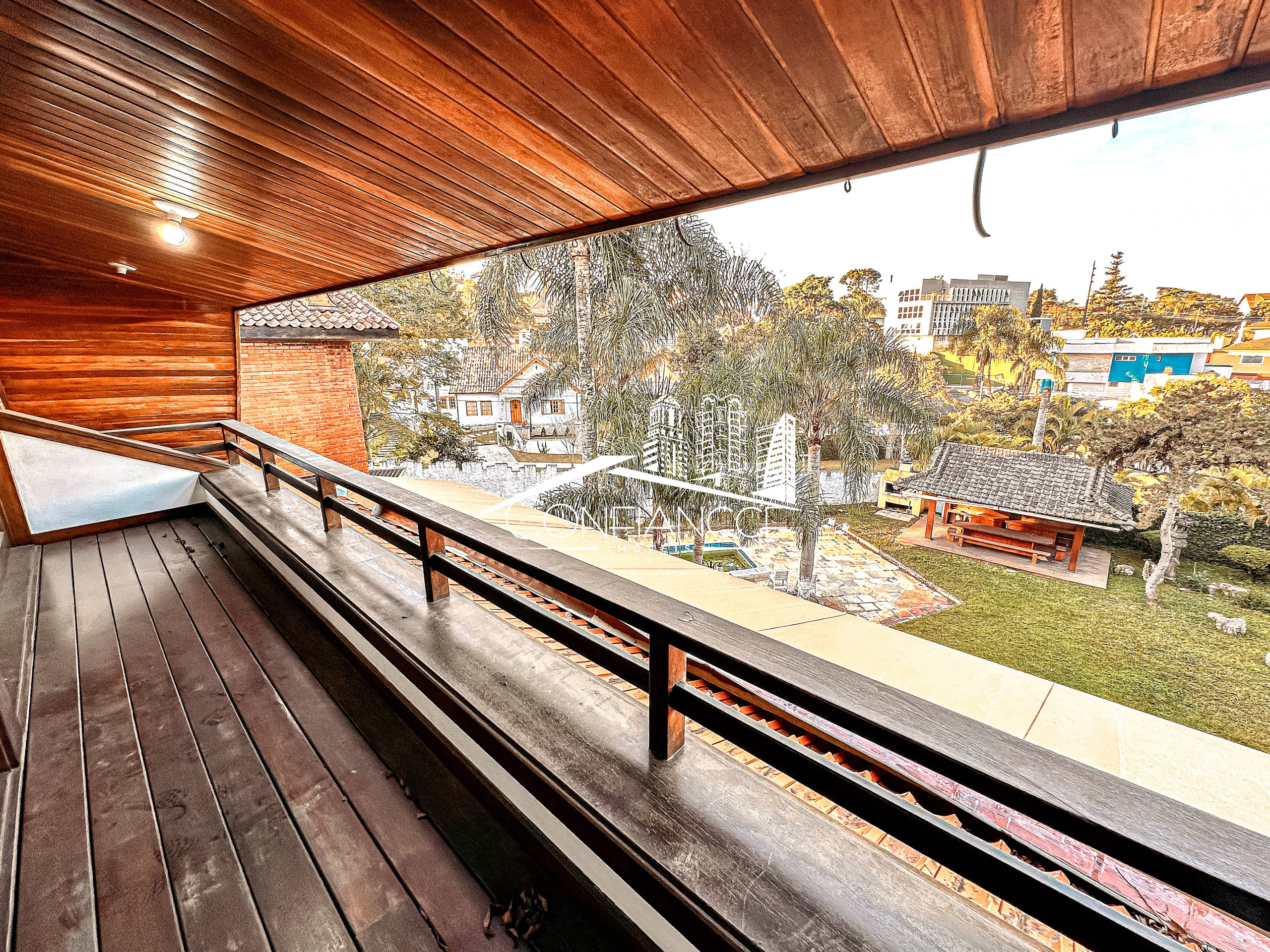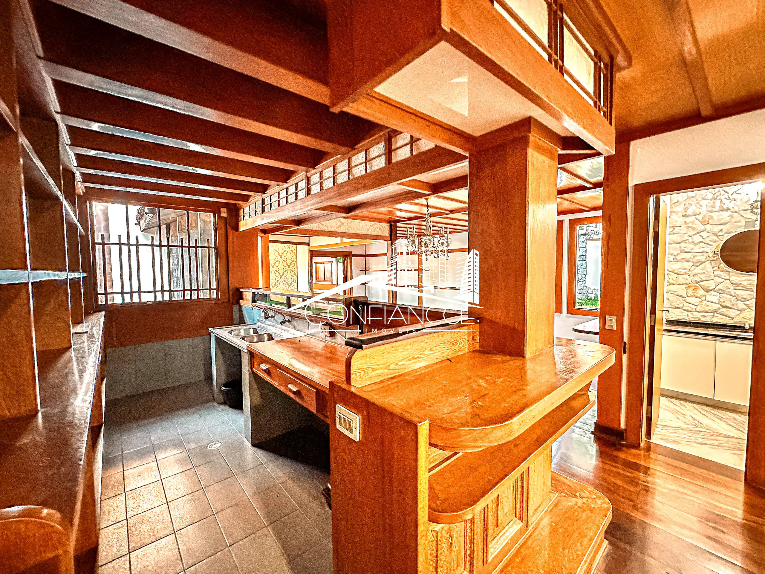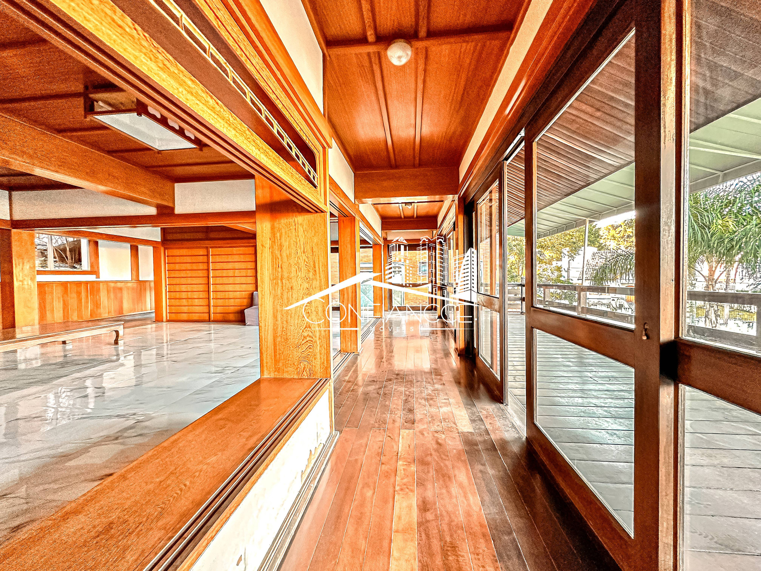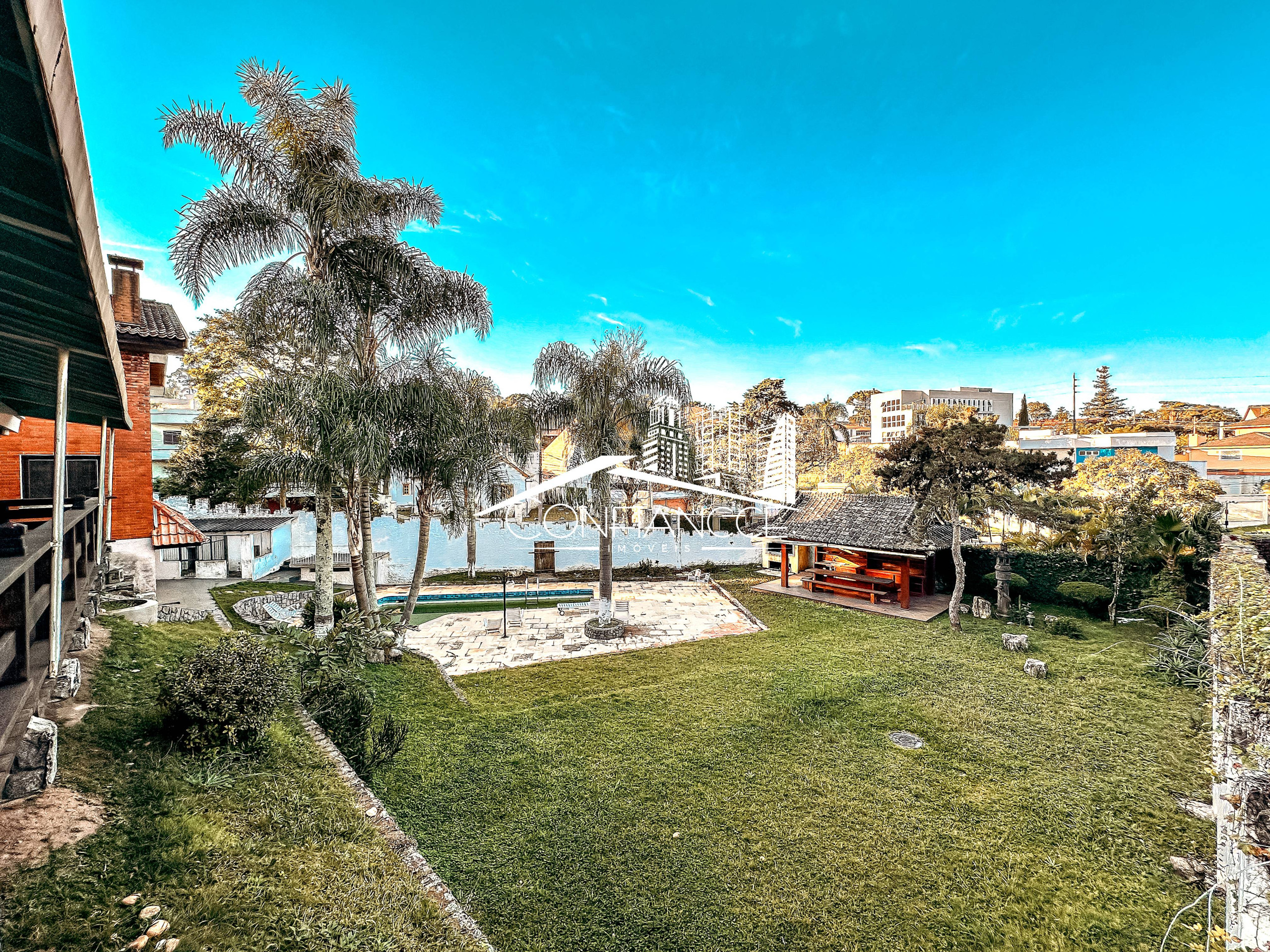 - Possui sala de estar, sala de jantar, cozinha com armários, 7 dormitórios (sendo 1 suíte), varanda, jardim, piscina, área de festas com churrasqueira, e vaga de garagem coberta e descoberta.
