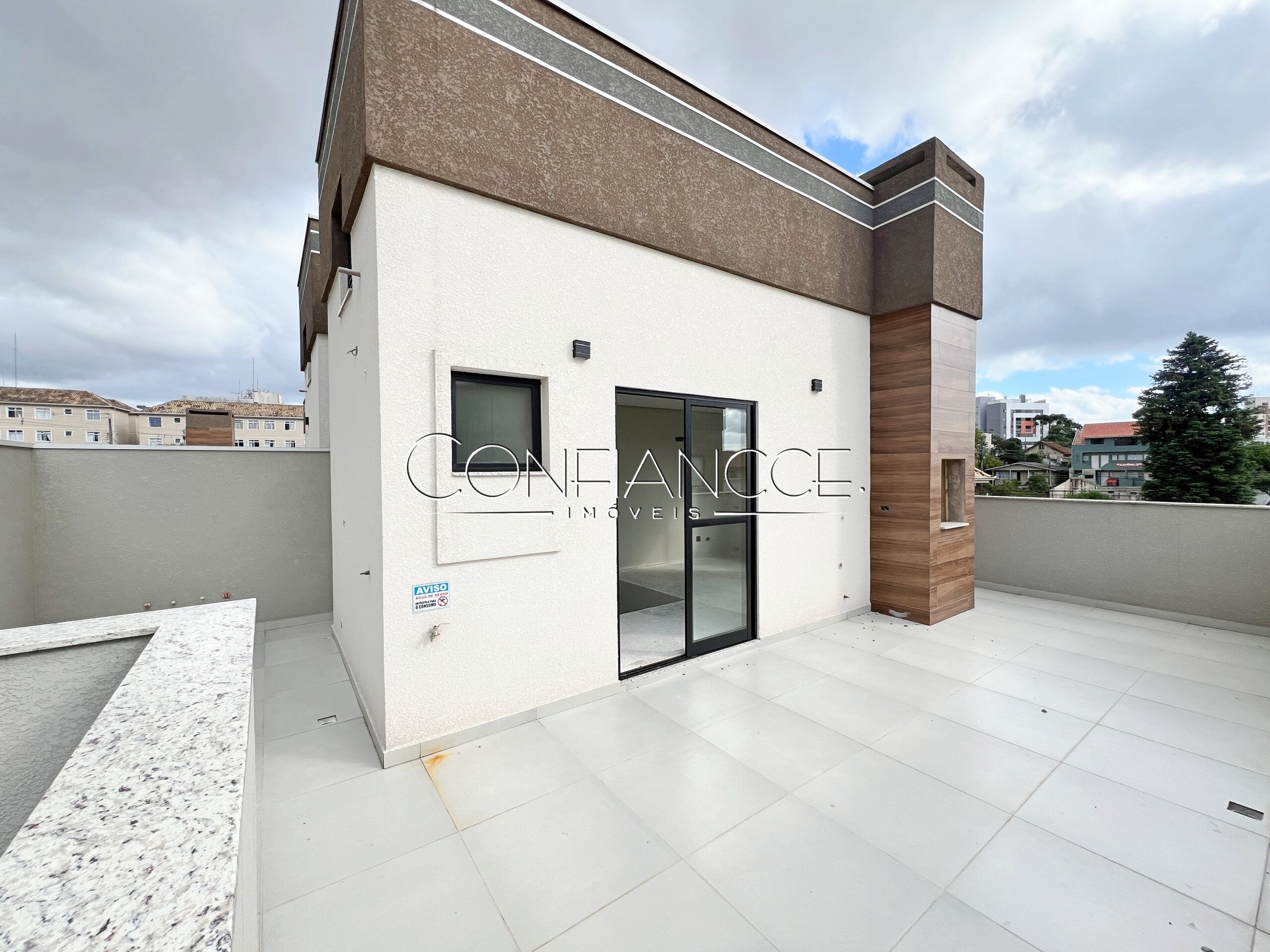 O ático oferece churrasqueira a carvão, banheiro com chuveiro e pia com água quente,